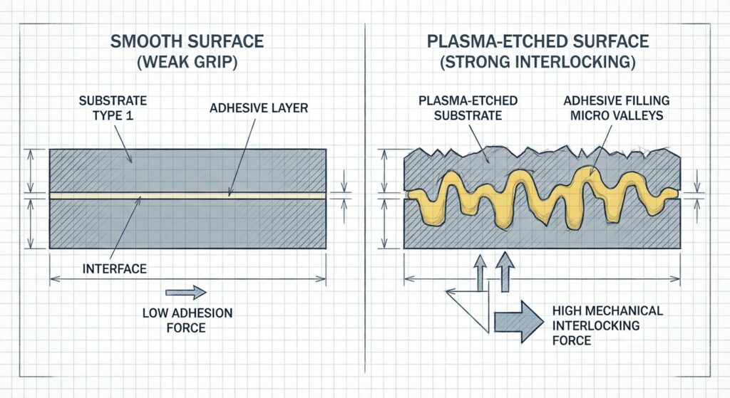 Plasma treatment creates controlled surface roughness through etching. This isn't random damage; it's a uniform increase in microscopic texture that provides numerous anchor points for adhesive molecules. This mechanical component significantly contributes to the overall bond strength.