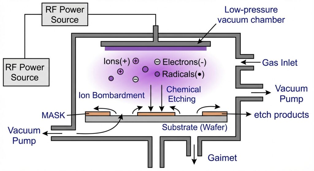 RIE has been the backbone of plasma etching technology for decades. This technique applies a radiofrequency (RF) electric field directly to the electrode holding the substrate, creating a self-bias that accelerates ions toward the surface.