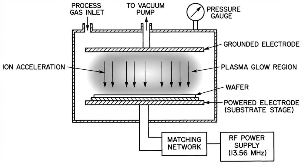 In an RIE system, the plasma is generated between two electrodes in a vacuum chamber. One electrode (the cathode) holds the substrate being etched, while the other (the anode) is grounded. When RF power is applied at 13.56 MHz, a glow discharge is initiated. The key characteristic of RIE is that the same RF field that creates the plasma also accelerates ions directly toward the substrate.