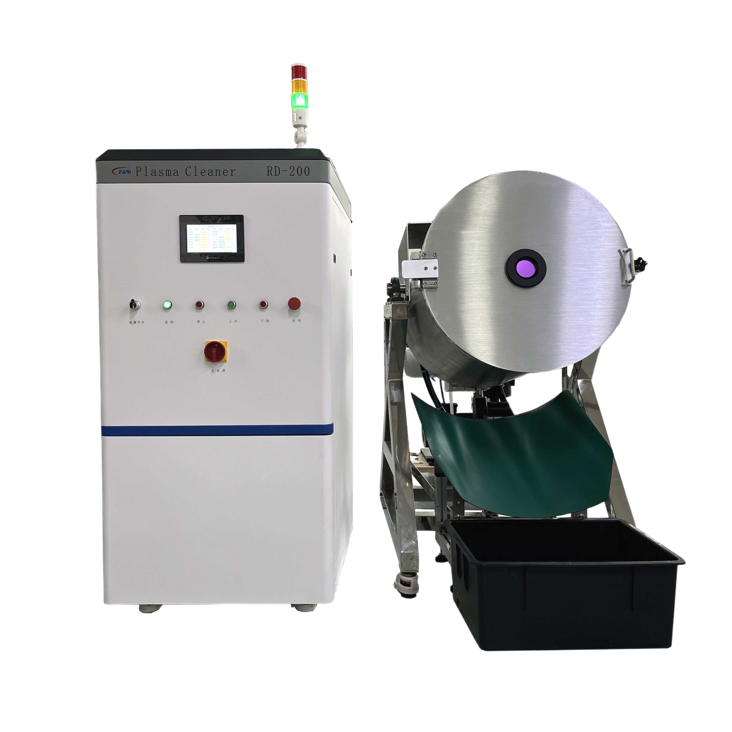 RD-200 is a large-capacity vacuum drum plasma cleaner with a 200L chamber (Φ610×700 mm). It features 40kHz plasma, adjustable 1–5 kW power, PLC + touchscreen control, dual gas MFC and 1–10 rpm drum rotation with 10 Pa vacuum.
