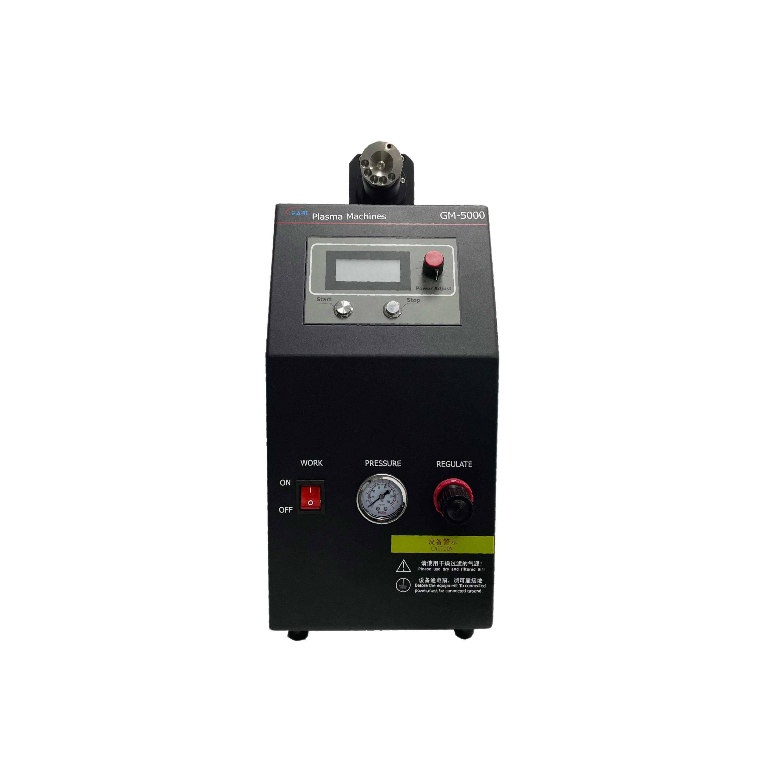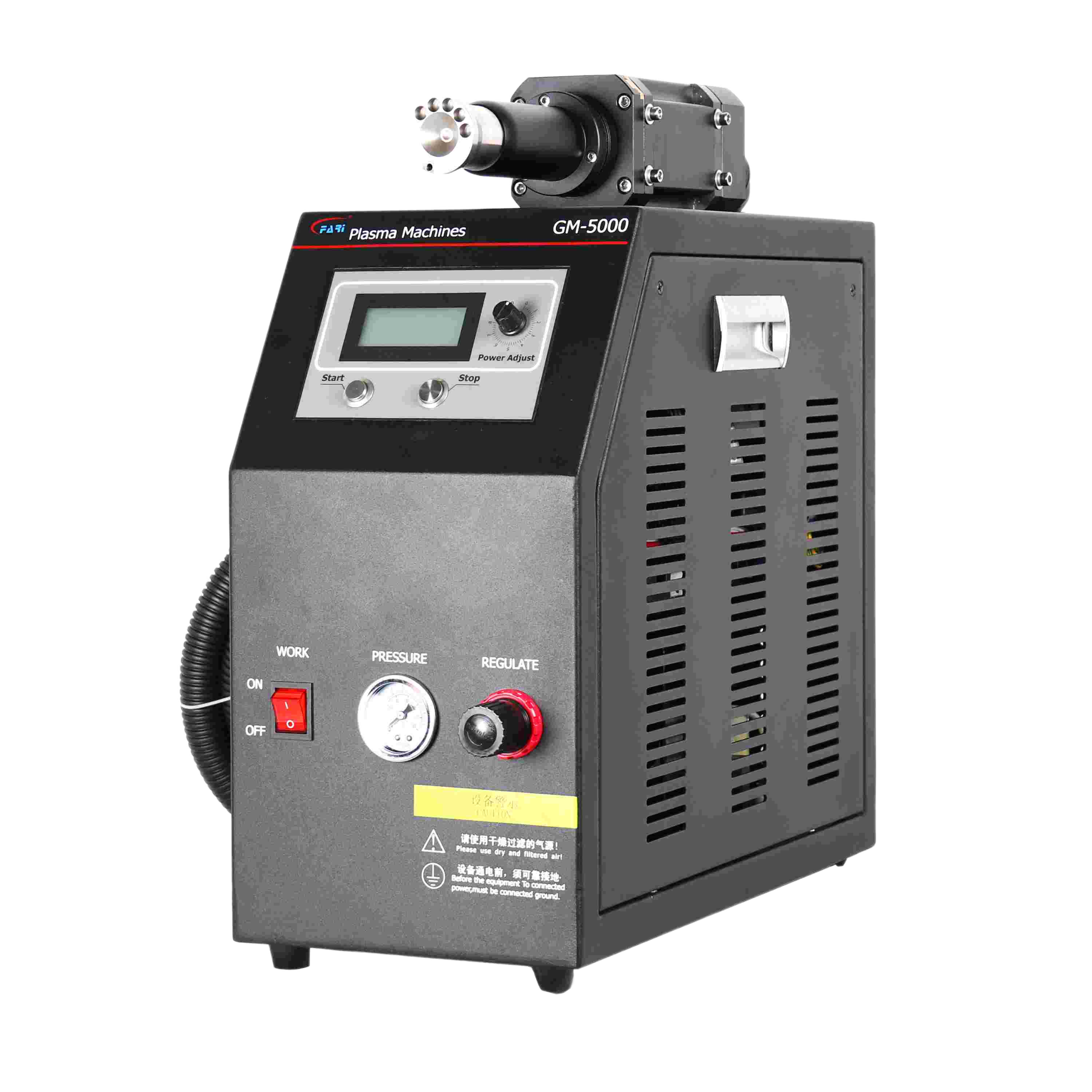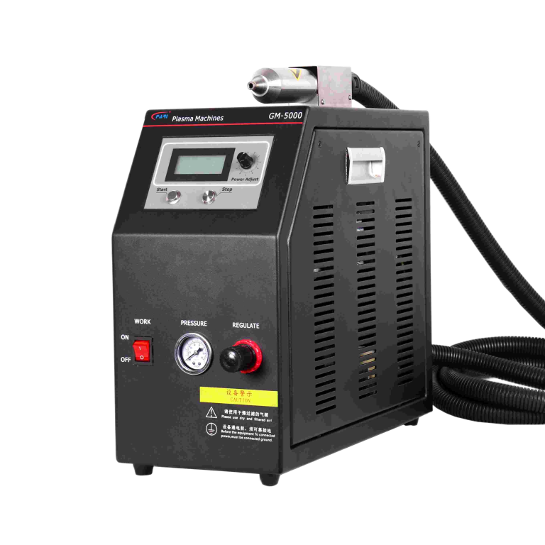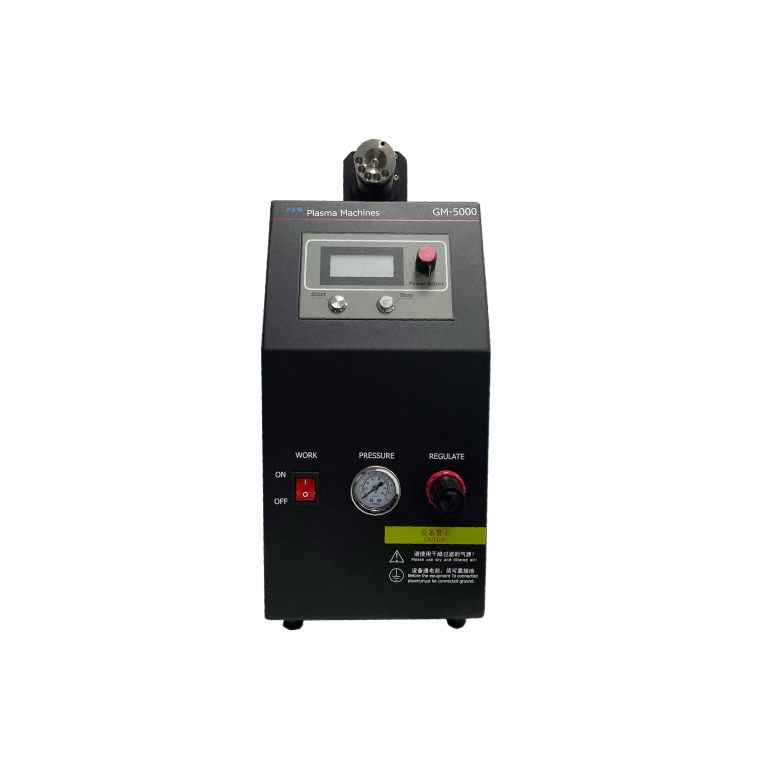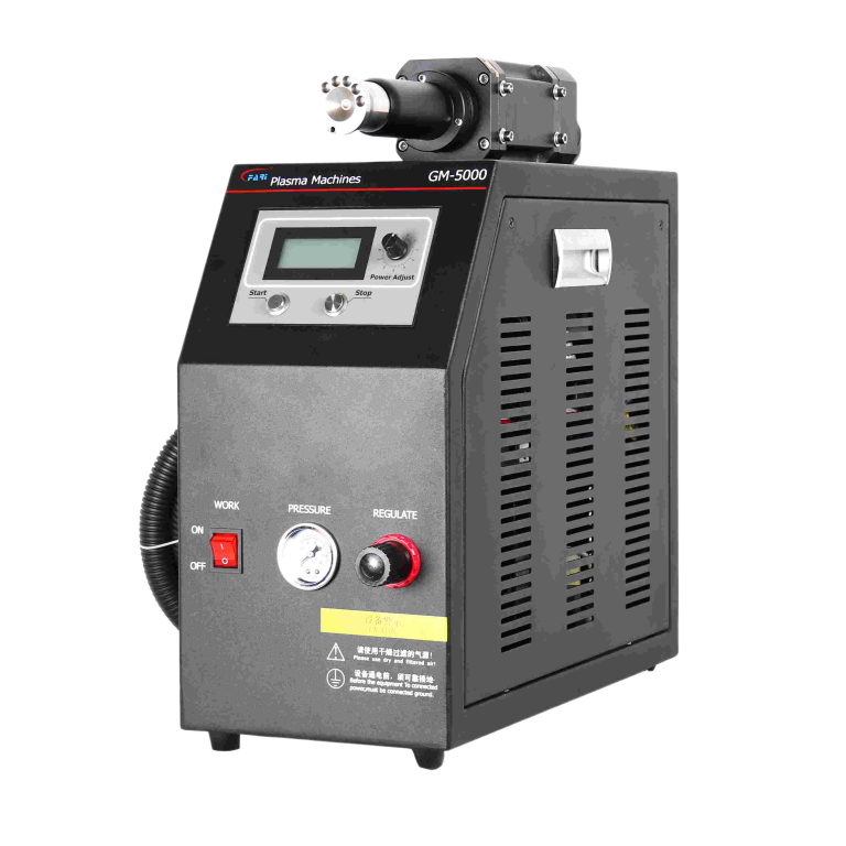 Compact inline GM-5000 plasma surface treater featuring a beltless silent nozzle, panel and remote analog power control, adjustable output up to 1200W, suitable for automation and inline integration.