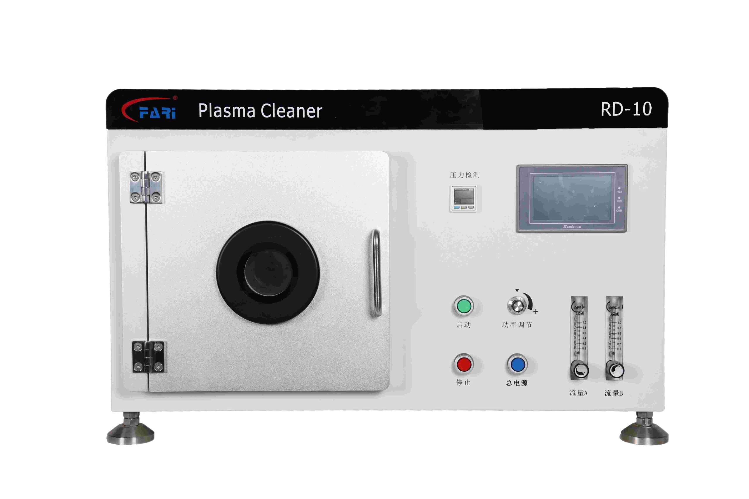 A compact rotary vacuum plasma cleaner with a 360° rotating reaction chamber for uniform, stable surface cleaning and activation of powders, particles and small irregular parts to improve adhesion.