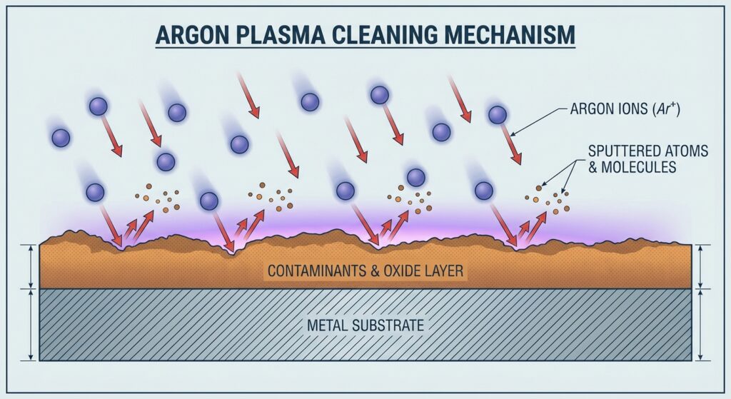 Argon plasma operates almost exclusively through physical sputtering. The energetic argon ions strike the surface with considerable force, mechanically dislodging contaminants, oxides, and other unwanted materials. Because argon is inert, it doesn't form new chemical compounds with the substrate material.