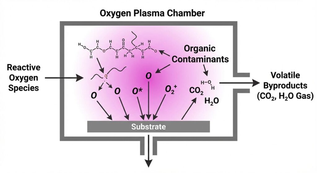 Oxygen plasma cleaning relies primarily on chemical reactions. The reactive oxygen species—including atomic oxygen, ozone, and oxygen ions—chemically attack and break down organic molecules, polymers, and contaminants. This is why oxygen plasma is particularly effective at removing organic residues.