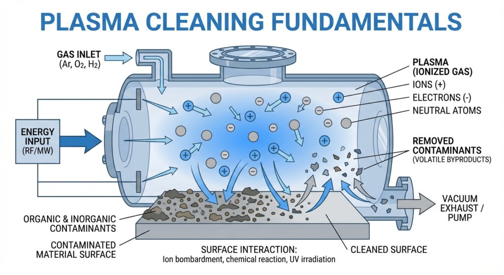 Plasma is ionized gas containing electrons, ions, and neutral atoms. When energy is applied to gas in a vacuum, it ionizes and creates plasma that removes surface contaminants.