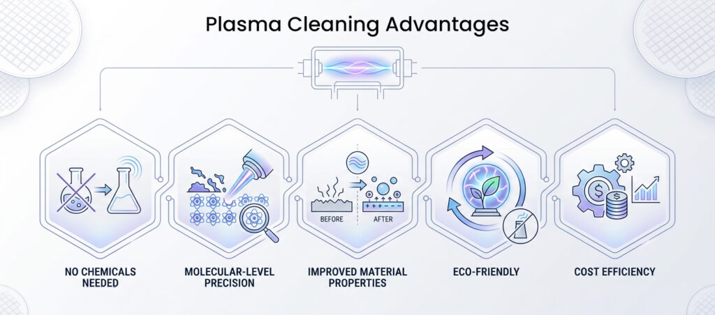 Traditional cleaning methods often rely on solvents and chemical baths—approaches that introduce environmental concerns, worker safety issues, and waste disposal challenges. Plasma cleaning achieves results without hazardous chemicals, producing only harmless gaseous byproducts.