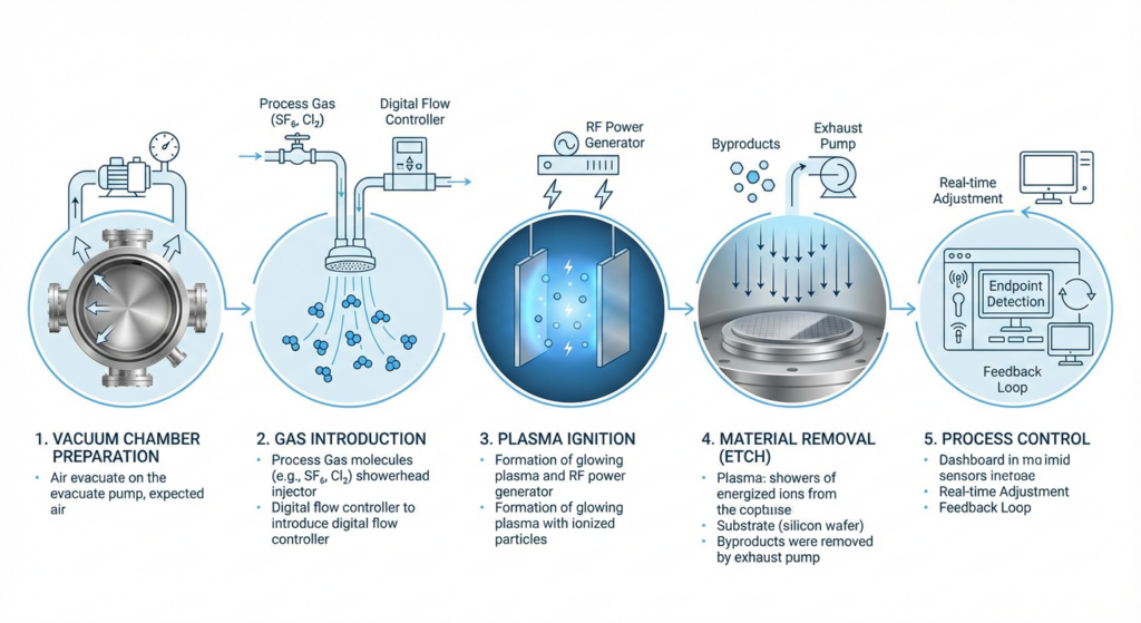 Once plasma is established, reactive species (ions, radicals, and excited atoms) interact with the substrate surface. Through the combined physical and chemical mechanisms described earlier, material is selectively removed according to the pattern defined by protective masks or resist structures.